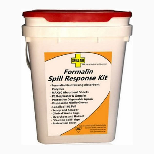 Formalin spill kits are designed to deal with spills of dilute aqueous solutions of formaldehyde or more commonly known as formalin. It reduces exposure to formaldehyde gas in the event of a spill. The neutralising powder contained in formalin spill kits will convert formalin into a passive, non-toxic substance. The super absorbent polymer cools down the solution and reduces formaldehyde concentration and is transformed into an easily removable semi-solid mass. The resulting mass cools rapidly minimising formaldehyde off-gassing. The conversion from a liquid hazard into an easily managed solidified gel only takes less than 5 minutes.