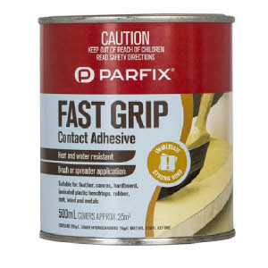 Immediate strong bond : Heat and water resistant : Brush application. Parfix Fast Grip is a solvent based contact adhesive that is heat and water resistant, making it suitable for use in kitchens and bathrooms.